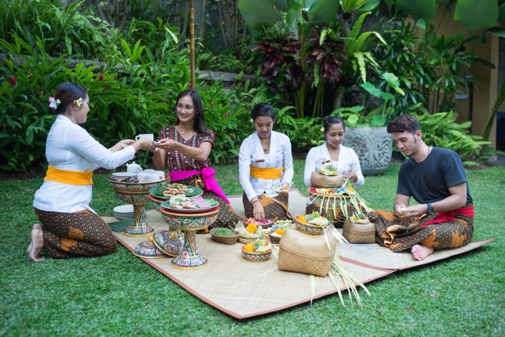 Balinese Offering Class. We conduct the offering class in our garden area. We will give you balinese sarong and welcome drink and then we will start to make offerings. We will guide you how to make canang sari, kwangen, ketupat or tipat.